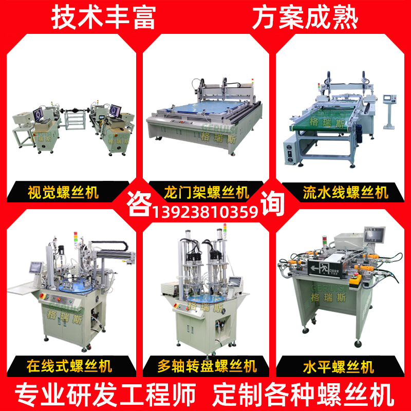多轴式自动锁螺丝机;也分为多轴转盘拧螺丝机、在线式多轴转盘锁螺丝机(配合流水线作业,带机械手自动卸料),多轴立式螺丝机(没有转盘),常用的主要有多轴转盘,转盘转台上课呀安装多个夹具放置产品,传动自动定位,多供料箱同时气吹送料到批头,然后一次拧紧所以螺丝螺钉,机械手吧拧好的产品取下来,可以防止到流水线上,有刻意放到装产品的容器里。